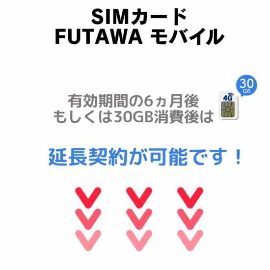 ・有効期間6ヵ月経過後、または30GBご使用後は当店で延長契約をお買い求め頂けます。