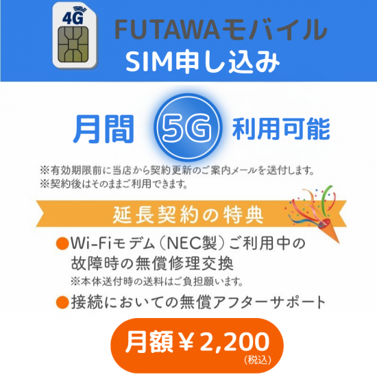【SIM5ギガ】 【継続利用】 最長5年間継続可能! FUTAWAモバイル SIMのお申し込みはコチラ。SIMの入替作業は不要。商品はそのまま継続利用可。 2,200円(内税)