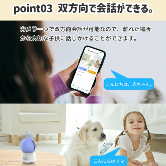 見守りカメラ 防犯カメラ 双方向通話 ビデオ通話 WiFi接続 お留守番 子供 高齢者 介護 見守り パンチルト 暗視可能 スマホから監視 ビデオ通話見守りカメラ 9,980円(内税)