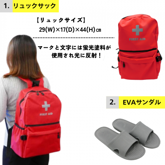 ・防災リュック、サンダル、ホイッスル、レインポンチョ、アルミブランケット、