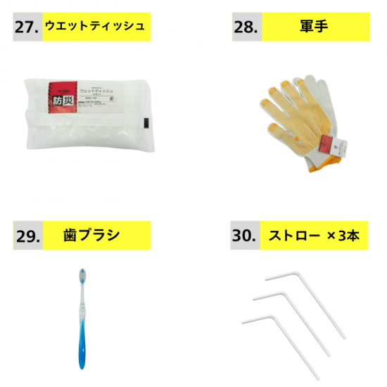 耳栓、ウェットティッシュ、軍手、歯ブラシ、ストロー